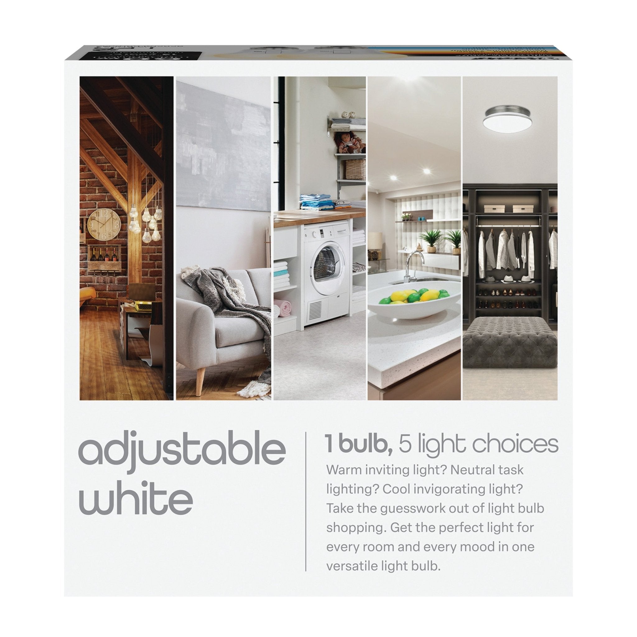 Get the right color light for any space with the Adjustable White 60-watt replacement A19 LED bulb from Feit Electric. Use the toggle on the bulb to select 2700K Soft White, 3000K Bright White, 3500K Neutral White, 4000K Cool White, or 5000K Daylight color temperatures. Set the mood during installation to match your existing lighting. Whether you want to energize your morning, focus on your tasks during the day, or wind down for the night, you can get the perfect energy-saving LED light in any room. No additional hardware or special apps are required. Selectable LED bulbs are rated to last 15,000 hours, for up to 13.7 years of dependable, even light.