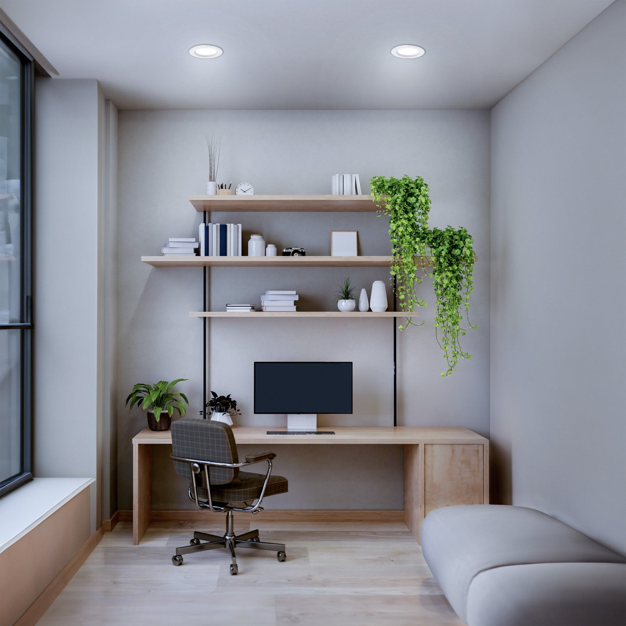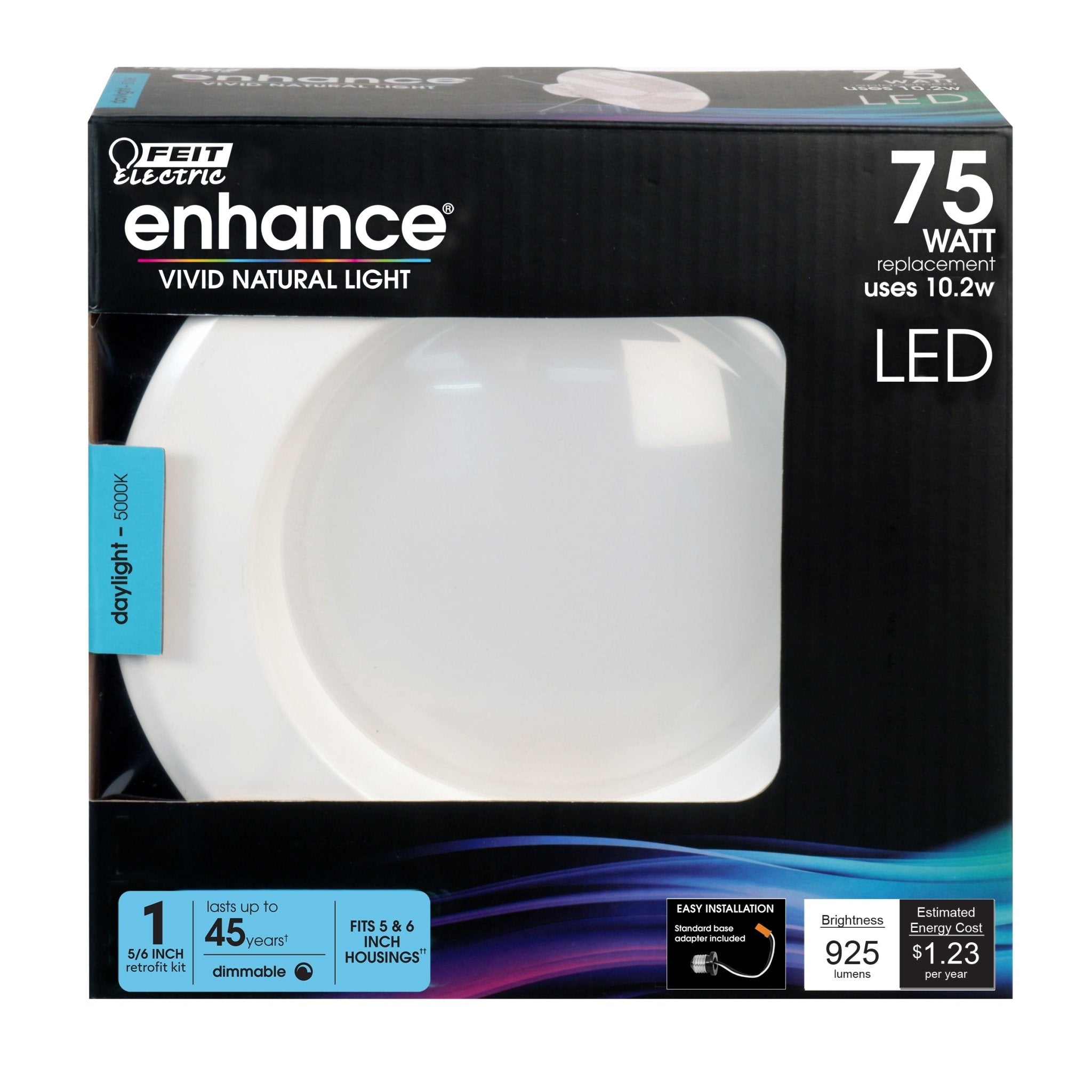 Enjoy all the benefits of advanced LED energy-saving technology with the 75W Feit Electric recessed downlights. This light will fit most 5 or 6-inch recessed can housings. It produces 925 lumens of 5000K Daylight color temperature light while using only 10.2 watts of electricity - up to 86% less energy than an equivalent 75-watt incandescent. Enhance® 90+ CRI color rendering makes colors appear more vibrant and skin tones look more natural. Each kit comes with a standard base adapter and a pre-mounted trim for easy installation. Integrated LEDs are designed to last 50,000 hours/46 years, eliminating the chore of changing bulbs.