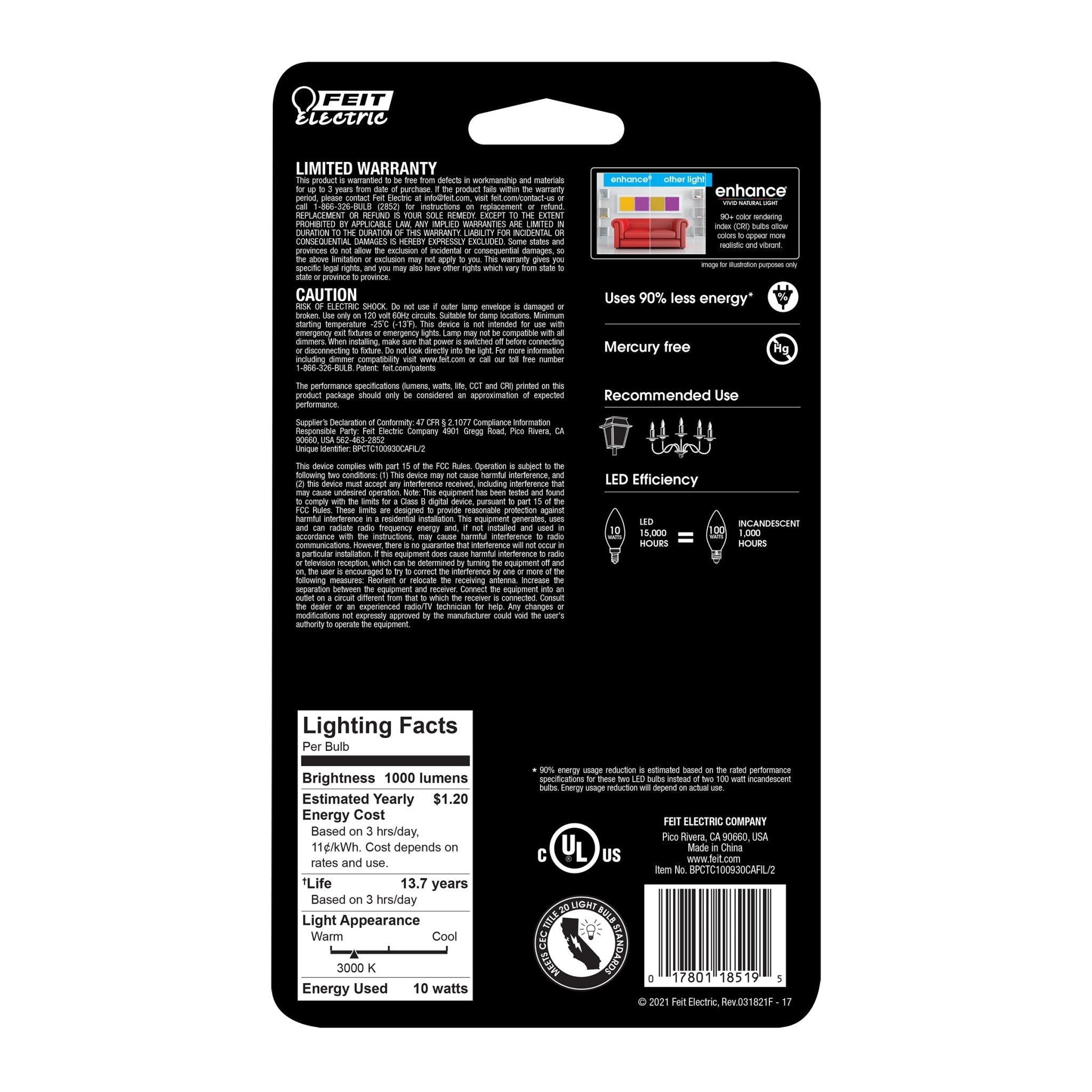 Combine the vintage glass filament lighting look and feel with the advantages of modern LED technology with these stylish light bulbs from Feit Electric. Energy efficient LEDs replace a 100-watt incandescent, producing a 3000K Bright White glow that gives the home a cozy feel. A stylish blunt tip shape with exposed filament wrapped in glass housing is ideal for chandelier fixtures and will enhance the décor of any room. Enhance 90+ CRI light makes colors vibrant and skin tones more natural, all while saving energy and lasting for decades.