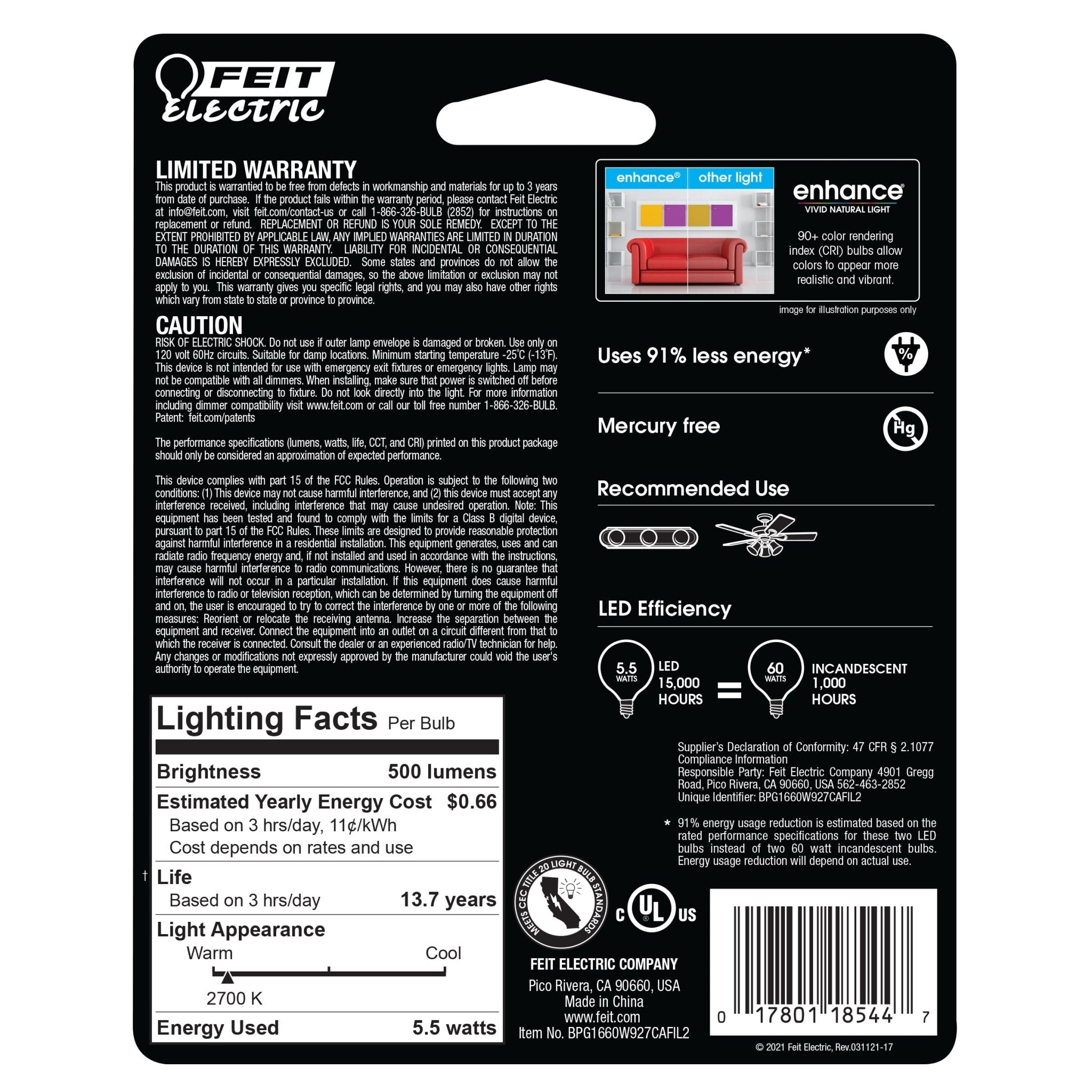 Combine the vintage glass filament lighting look and feel with the advantages of modern LED technology with these stylish light bulbs from Feit Electric. Energy-efficient LEDs replace a 60-watt incandescent, producing a 2700K Soft White glow that gives the home a cozy feel. A frosted G16 1/2 mini-globe design with exposed filament wrapped in frosted glass housing is ideal for chandelier fixtures and will enhance the décor of any room. Enhance 90+ CRI light makes colors vibrant and skin tones more natural, all while saving energy and lasting for decades.