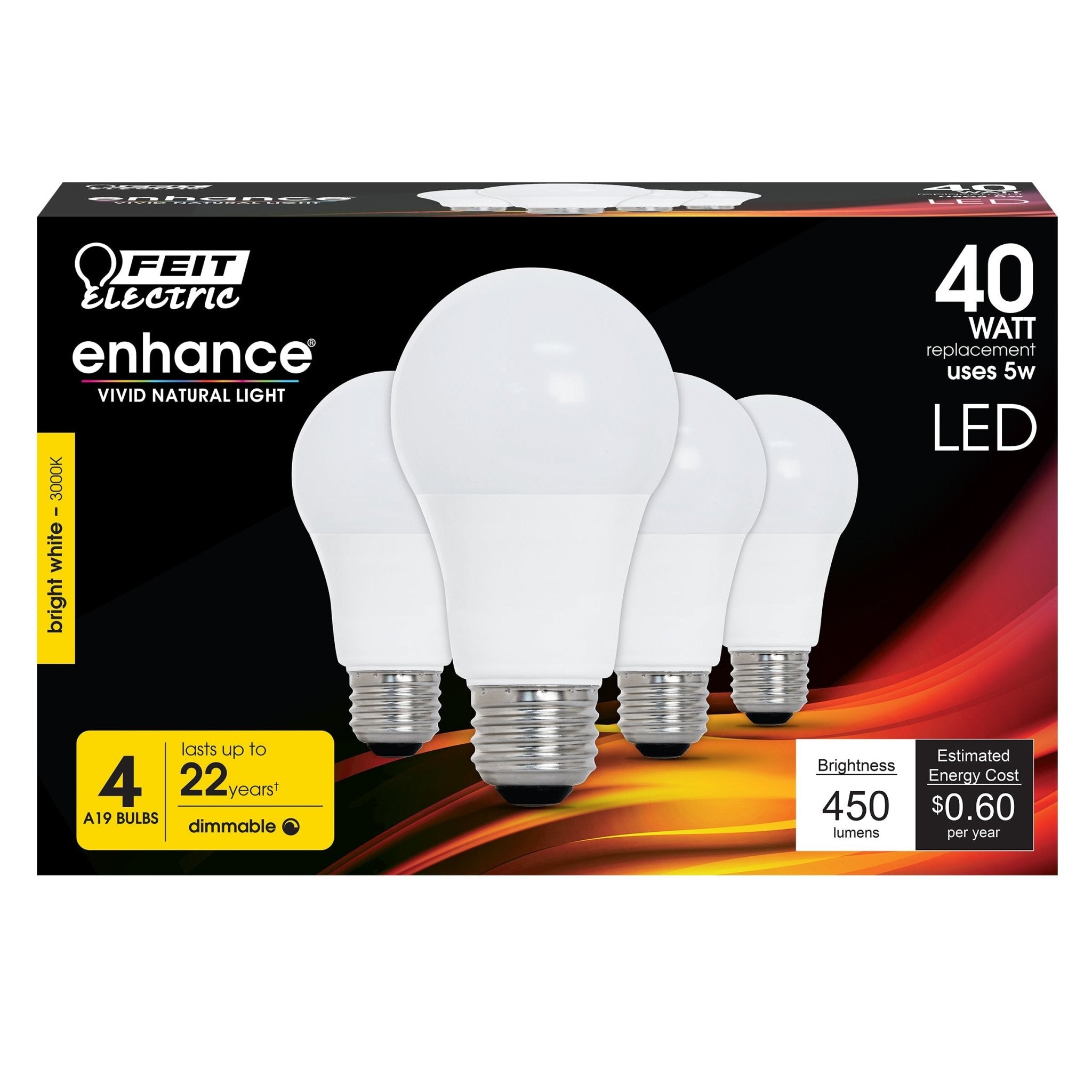 The Feit Electric LED Enhance product line features our highest quality energy efficient light. This Warm White omni directional A19 LED light bulb produces a similar light output while using less energy than a standard 40-watt incandescent light bulb. This high performance bulb also has a high (CRI) of 90+ so colors appear more realistic and vibrant. Get instant on to full brightness with relatively cool running performance. These Feit Electric A19 bulbs have an average life of 25,000 hours/22.8 years are RoHS compliant, and are 100% mercury free. Choose a dependable LED bulb for general purpose residential or commercial applications. Suitable for enclosed fixtures and outdoor use.