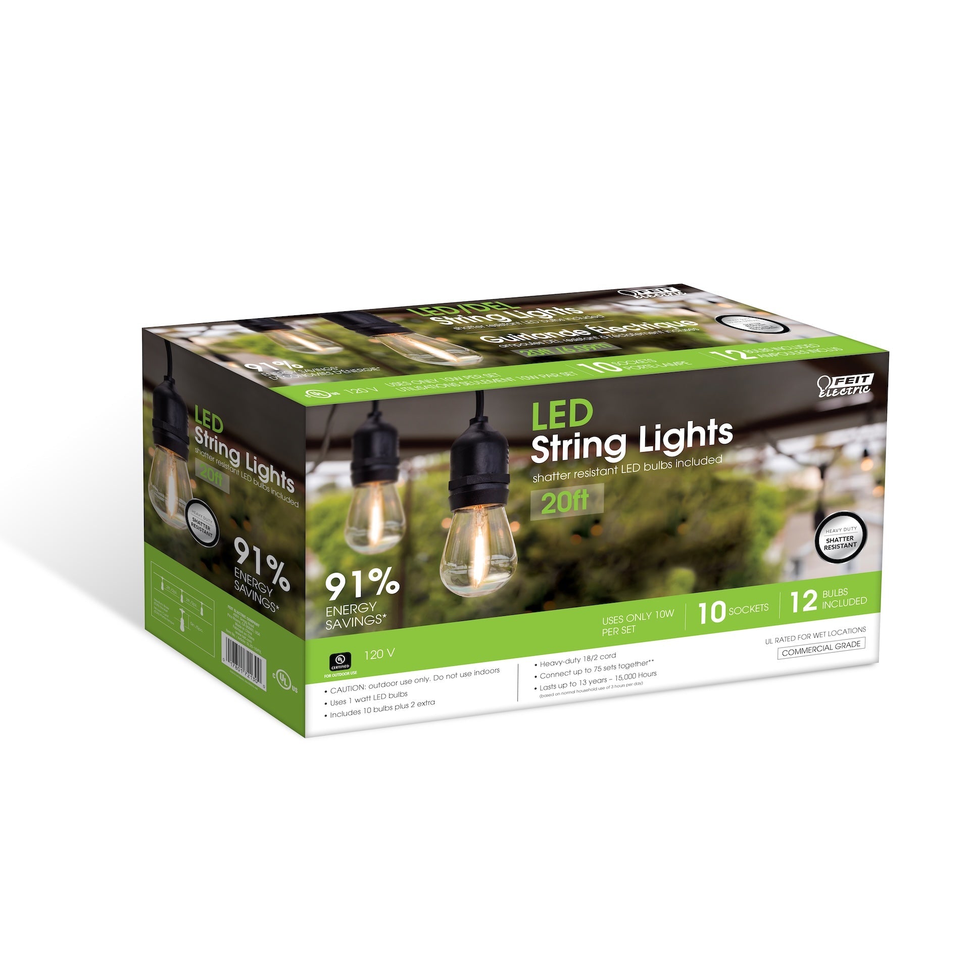 Turn any space into The Space with the Feit Electric SL20-10/FIL String Lights. These string lights extend up to 20 feet in length and are illuminated by S14 String Light Bulbs. Their warm amber glow creates the perfect atmosphere for gazebos, patios, and pergolas. Bring an enchanting atmosphere to cafés and outdoor gatherings. These String Lights are made with commercial-strength, heavy-duty 18/2 cord that is built to withstand extreme temperatures and harsh environments. It's the perfect year-round outdoor accent lighting solution. Each 20-foot string light set includes 10 light sockets with 10 decorative clear LED bulbs and 2 spare bulbs. The string light set is designed to allow the entire chain to stay lit even if one bulb goes out. Choose a dependable energy-efficient lighting solution set that’s simple to install and easy to extend up to 75 sets end to end safely. Turn your space into the next big outdoor destination.