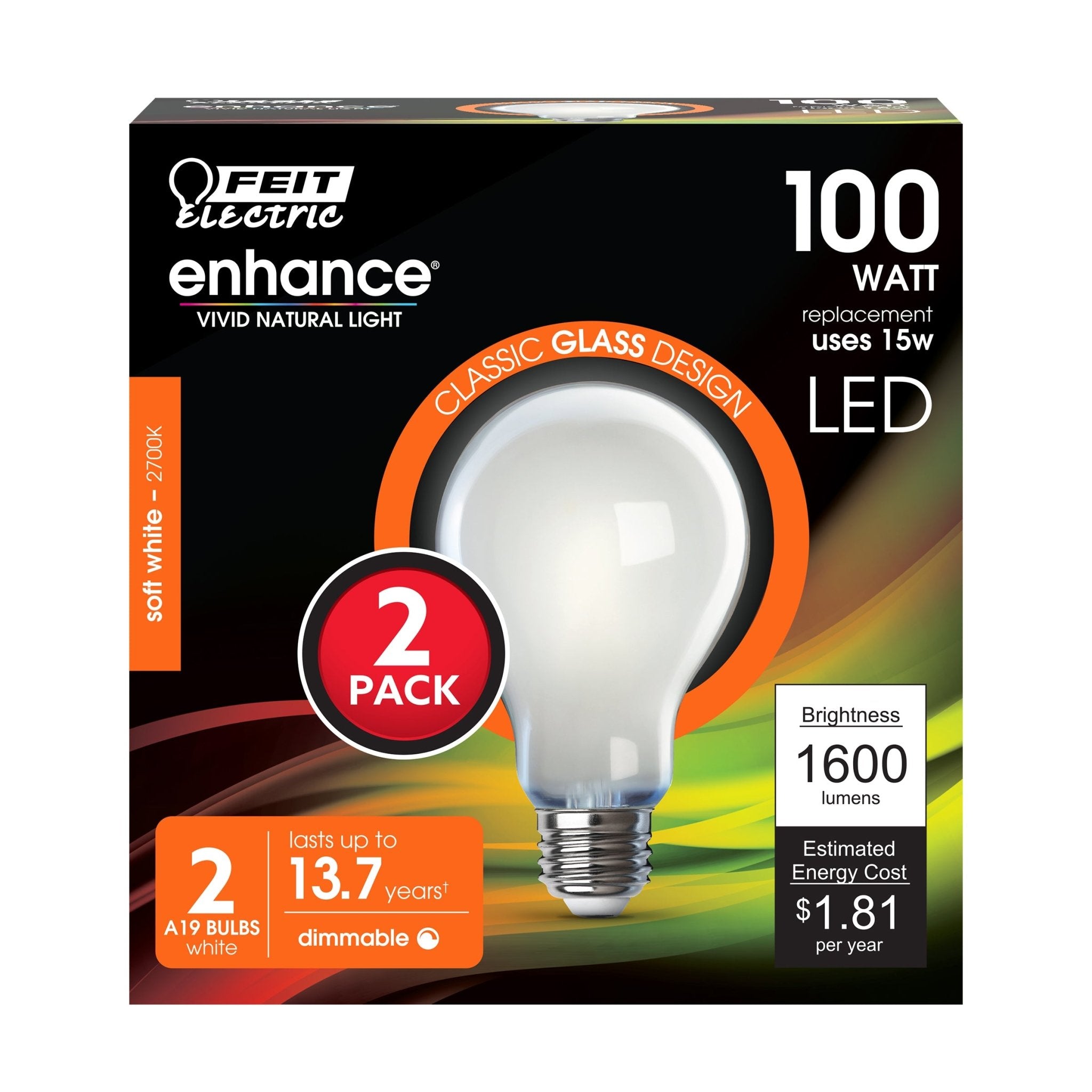Enjoy all the benefits of advanced LED energy-saving technology with A100/927CA/FIL/2 dimmable LED light bulbs from Feit Electric. These frosted LED bulbs replace 100-watt incandescents, producing 1600 lumens of Soft White light while using only 15 watts of electricity - saving up to 85% in energy costs. Enhance 90+ CRI light makes colors look more vibrant and skin tones look more natural. A traditional A-shaped design with frosted glass brings a softer, diffused glow to the décor of any room. Feit Electric filament LED bulbs have an average life of 15,000 hours/13.7 years, are RoHS compliant and are 100% mercury free. Choose a dependable decorative bulb to brighten your home.