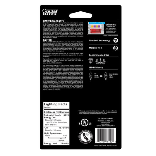 10W (100W Replacement) Bright White (3000K) E12 Base B10 Blunt Tip Dimmable Filament LED Bulb (2-Pack)