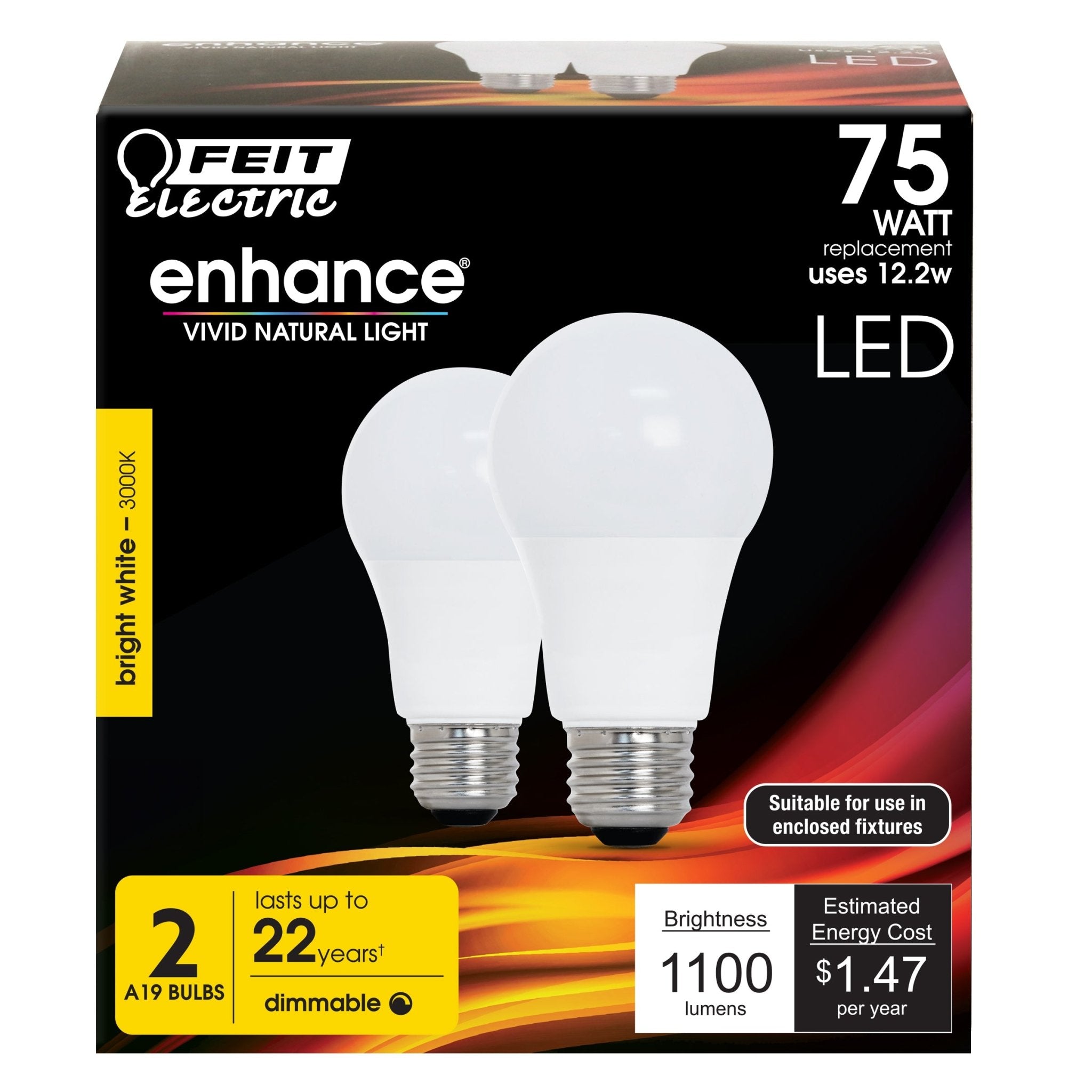 The Feit Electric LED Enhance product line features our highest quality energy efficient light. This Bright White omni directional A19 LED light bulb produces a similar light output while using less energy than a standard 75-watt incandescent light bulb. This high performance bulb also has a high (CRI) of 90+ so colors appear more realistic and vibrant. Get instant on to full brightness with relatively cool running performance. These Feit Electric A19 bulbs have an average life of 25,000 hours/22.8 years are RoHS compliant, and are 100% mercury free. Choose a dependable LED bulb for general purpose residential or commercial applications. Suitable for enclosed fixtures and outdoor use.