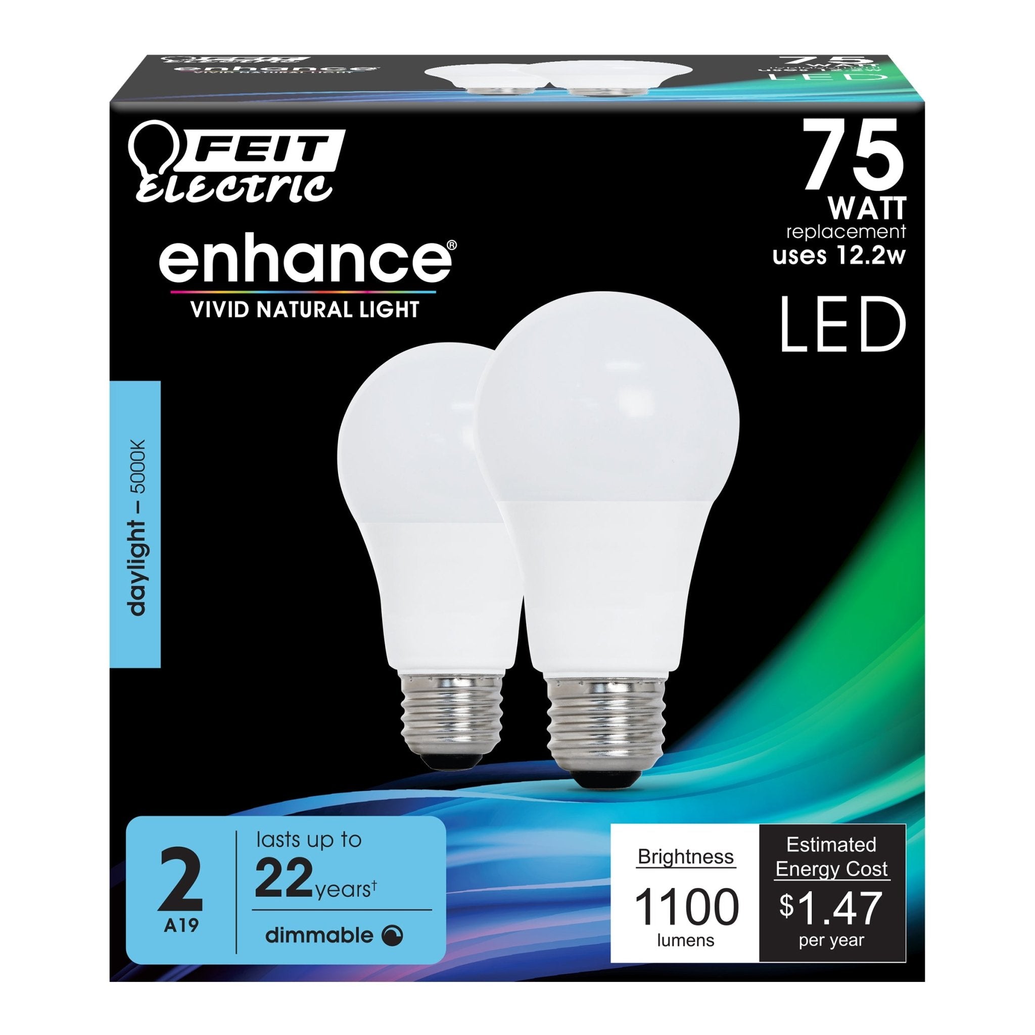 The Feit Electric LED Enhance product line features our highest quality energy efficient light. This bright daylight omni directional A19 LED light bulb produces a similar light output while using less energy than a standard 75-watt incandescent light bulb. This high performance bulb also has a high (CRI) of 90+ so colors appear more realistic and vibrant. Get instant on to full brightness with relatively cool running performance. These Feit Electric A19 bulbs have an average life of 25,000 hours/22.8 years are RoHS compliant, and are 100% mercury free. Choose a dependable LED bulb for general purpose residential or commercial applications. Suitable for enclosed fixtures and outdoor use.
