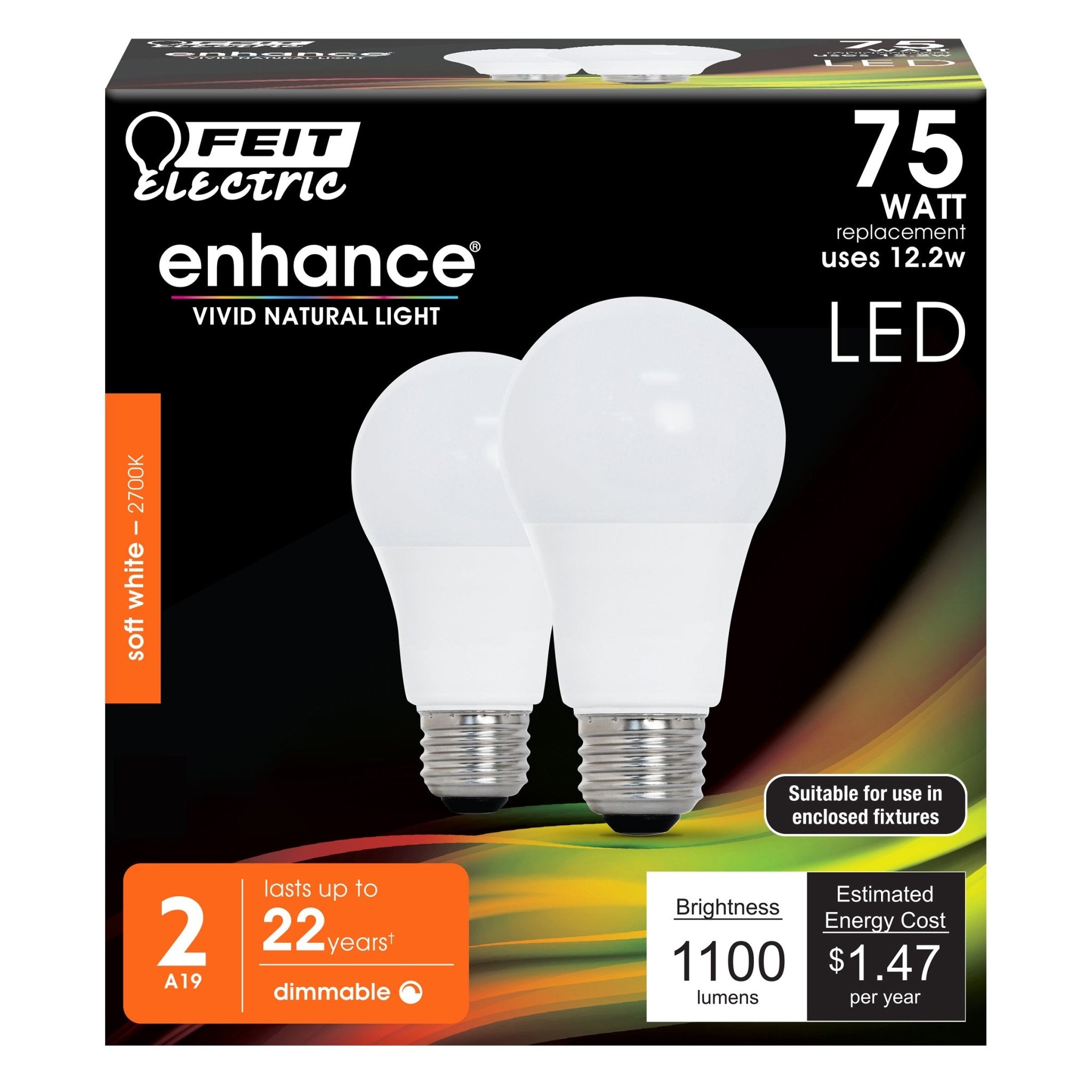 The Feit Electric LED Enhance product line features our highest quality energy efficient light. This soft white omni directional A19 LED light bulb produces a similar light output while using less energy than a standard 75-watt incandescent light bulb. This high performance bulb also has a high (CRI) of 90+ so colors appear more realistic and vibrant. Get instant on to full brightness with relatively cool running performance. These Feit Electric A19 bulbs have an average life of 25,000 hours/22.8 years are RoHS compliant, and are 100% mercury free. Choose a dependable LED bulb for general purpose residential or commercial applications. Suitable for enclosed fixtures and outdoor use.