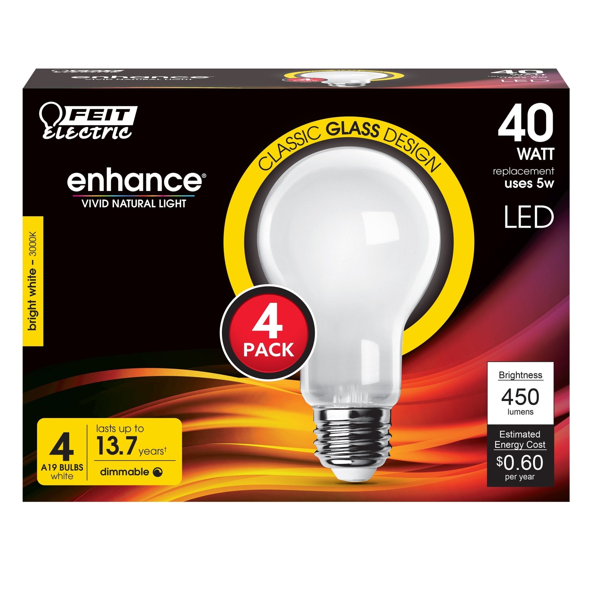 Enjoy classic style, modern reliability, and energy savings with the Feit Electric A1940CL930CA/FIL/4 four-pack of Enhance LED light bulbs. These beautiful high-performance bulbs feature LED filament strips housed in frosted glass, saving energy while providing the look of a traditional bulb. Each bulb outputs 450 lumens of 3000K Bright White light while using only 5 watts - a saving of up to 85% in energy costs over an equivalent 40-watt incandescent. Enhance® 90+ CRI color rendering makes colors appear more vibrant and skin tones look more natural. Customize the mood in your space with smooth dimming when combined with LED-compatible dimmer switches (sold separately). Enhance A19s last up to 15,000 hours and are suitable for a variety of general-purpose lighting applications.