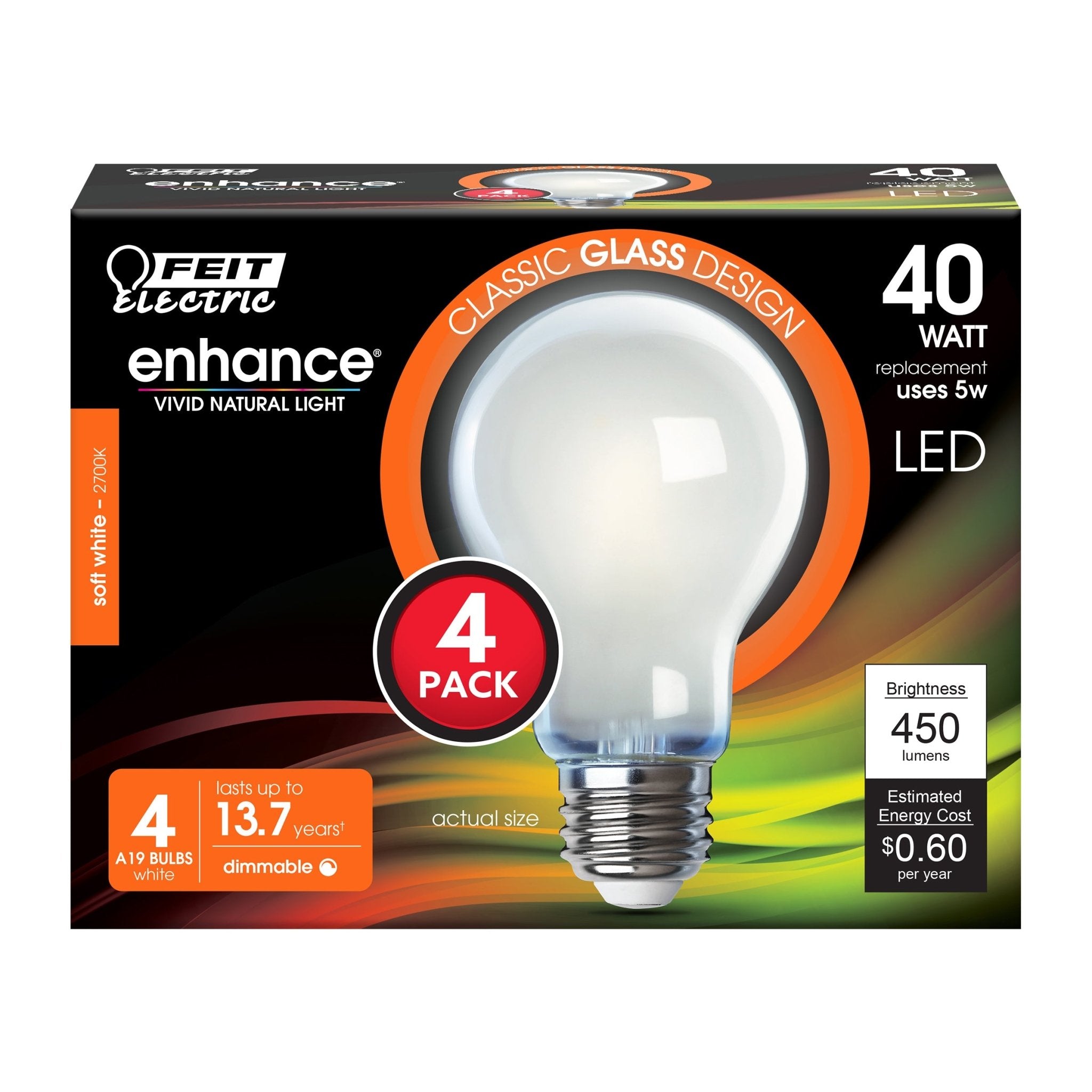 Enjoy all the benefits of advanced LED technology with Feit Electric LED Bulbs. These frosted 2700K Soft White light bulbs provide warm, inviting light. They're perfect for use in living rooms, dining areas, and bedrooms. Get smooth dimming with LED-compatible dimmer switches. Their 90+ CRI rating makes colors appear more vibrant and skin tones look more natural. These bulbs replace 40-watt incandescent bulbs using 87.5% less energy. Each bulb produces a 450-lumen light output using only 5 watts of electricity. Get instant on to full brightness with relatively cool running performance. Feit Electric A1940/927CA/FIL/4 frosted A19 light bulbs have an average life of 15,000 hours/13.7 years. They are RoHS compliant and 100% mercury free. The estimated annual energy cost is only $0.60/year (based on 3 hours per day of use). Choose a dependable decorative bulb for residential or commercial applications.