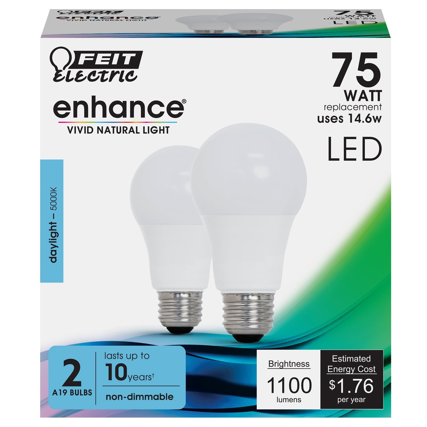 Enjoy all the benefits of advanced LED energy-saving technology with the Feit Electric A19 75W equivalent Enhance LED Light Bulb. Enhance light bulbs feature high color rendering index light with superior light quality and rich vivid color. This high CRI warm white light replaces a 75-watt equivalent incandescent bulb produces a similar light output using less electricity and is omni directional for all around light distribution. Get instant on to full brightness with relatively cool running performance. These Feit Electric A19 bulbs have an average life of 11,000 hours/10 years are RoHS compliant, and are 100% mercury free. Choose a dependable LED bulb for general purpose residential or commercial applications.