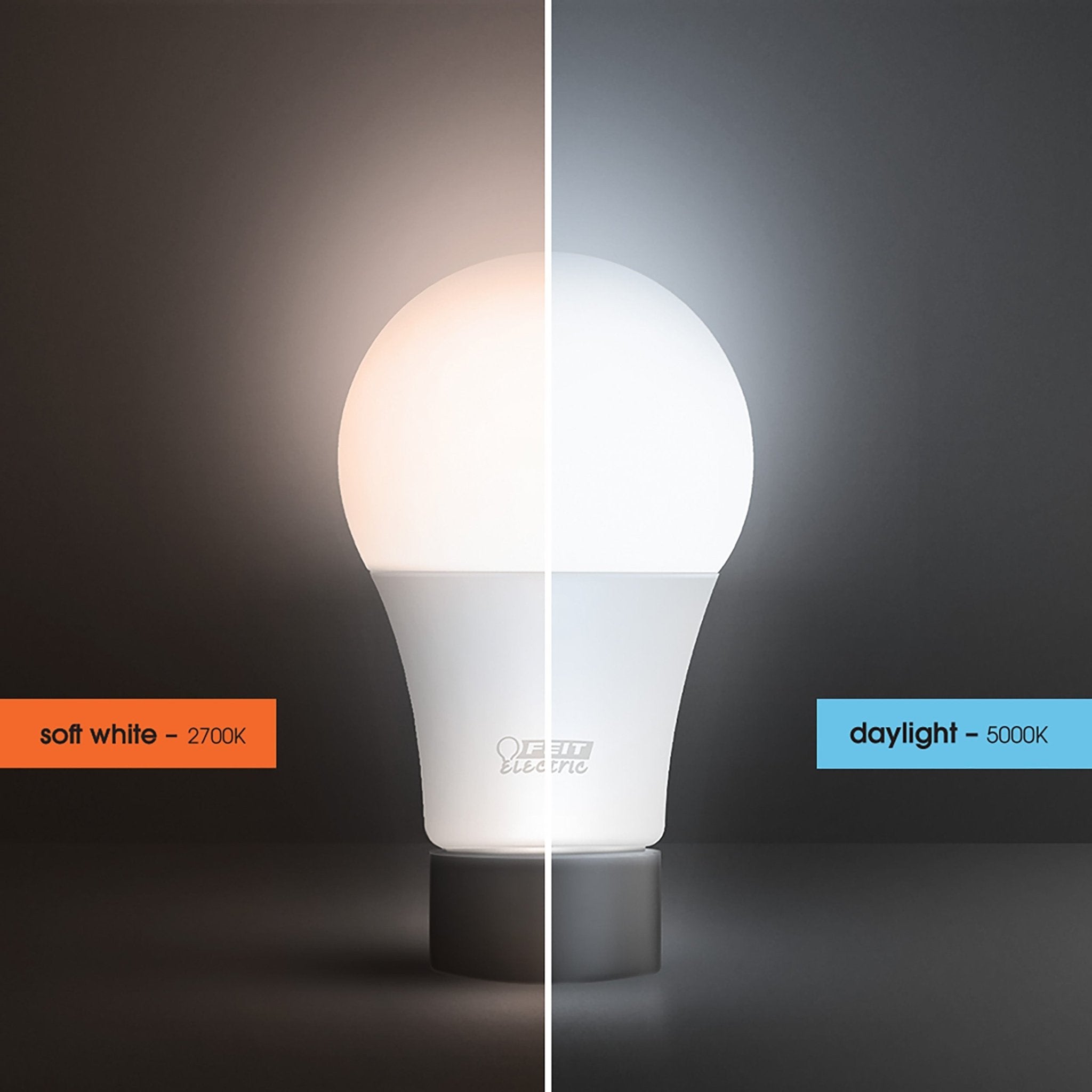 Enjoy all the benefits of advanced LED energy-saving technology with the Feit Electric OM60DM/950CA/8 8-pack of LED light bulbs. These versatile A19 shape bulbs produce 800 lumens of 5000K Daylight White light using just 8.8 watts - up to 85% less than an equivalent 60-watt incandescent. High 90+ CRI makes colors vibrant and skin tones more natural, all while saving energy and lasting for decades. Daylight White color temperature is ideal in kitchens, offices, and anywhere you need energizing light for seeing things in fine detail. LED bulbs last up to 25,000 hours/22.8 years. Their estimated annual energy cost is only $1.06. Choose a dependable LED light bulb for your home or business projects.