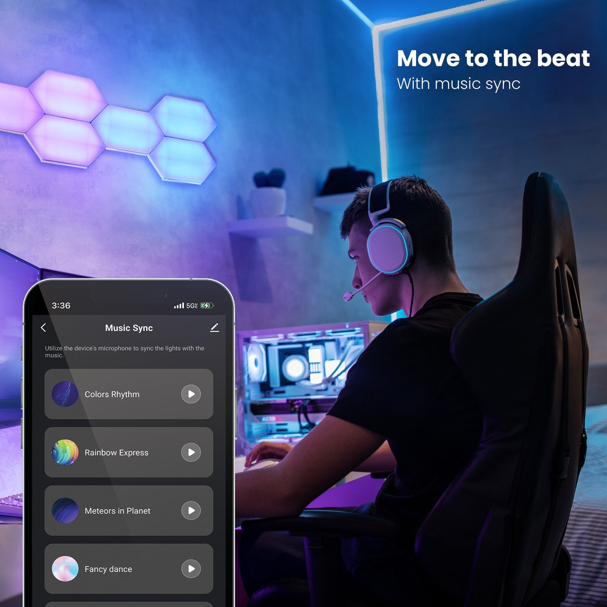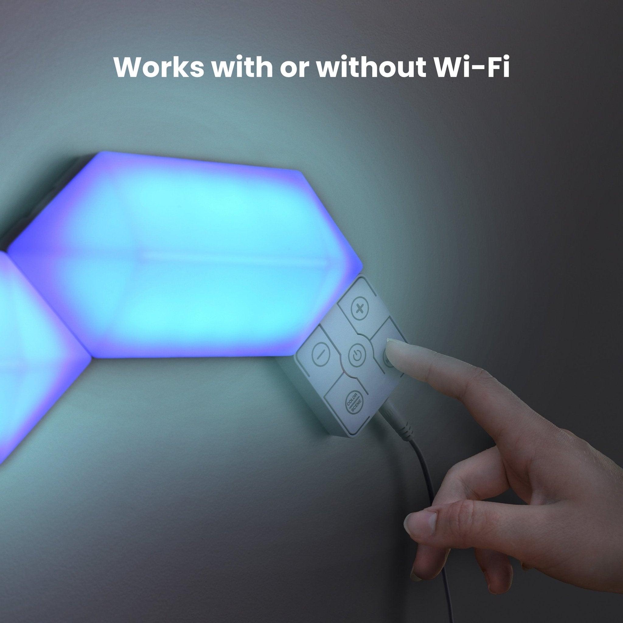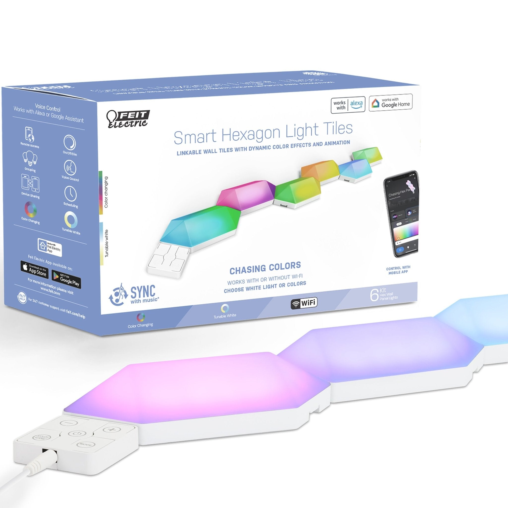 Transform your living space into an immersive experience with our Smart Linkable Hexagon Light Tiles 6-Pack Starter Kit. This kit comes with six mesmerizing hexagon-shaped lights. It is packed with cutting-edge features to elevate your lighting experience. Unleash your inner artist and create the perfect ambiance for gaming sessions, movie nights, and parties by selecting individual colors for each panel. Add bold color to your living room, bedroom, or any other space in your home. Get access to millions of colors at your fingertips. With independent color control, you can mix, match, and customize hues to suit your mood. Then, take your lighting display further with captivating effects that flow from panel to panel. Our hexagon-shaped lights feature directional links that follow the arrows, making it a breeze to set up your desired configurations. Turn on the music sync feature to match lights to the rhythm of your favorite tunes. Choose from 17 preset scenes to fit seasons, moods, or activities. Pairing Smart Hex Wall Panel Lights is quick and easy. Integrate them into your smart home ecosystem with the free Feit Electric app and 2.4GHz home Wi-Fi. Add voice commands with Alexa and Google Assistant compatibility for even more control. Upgrade your lighting game and get creative with Smart Hex Wall Lights from Feit Electric. Embrace the artistic side of smart lighting.